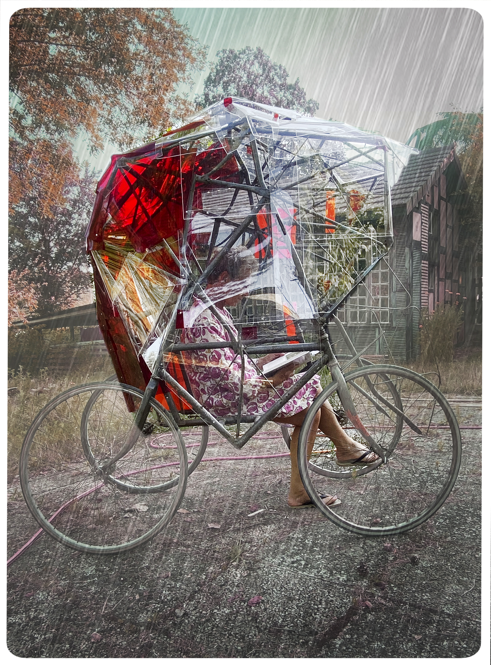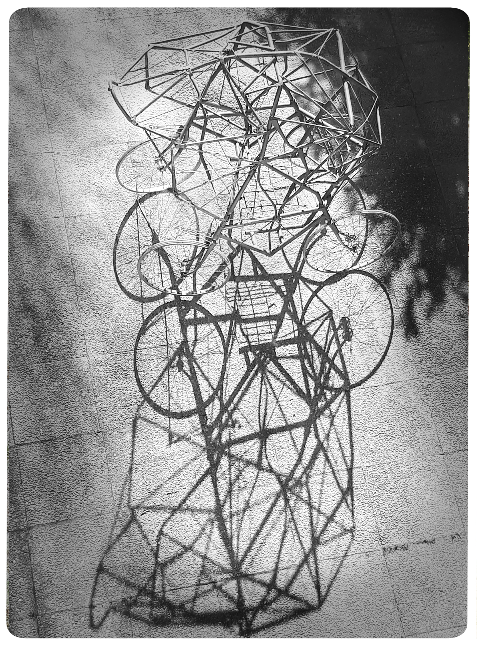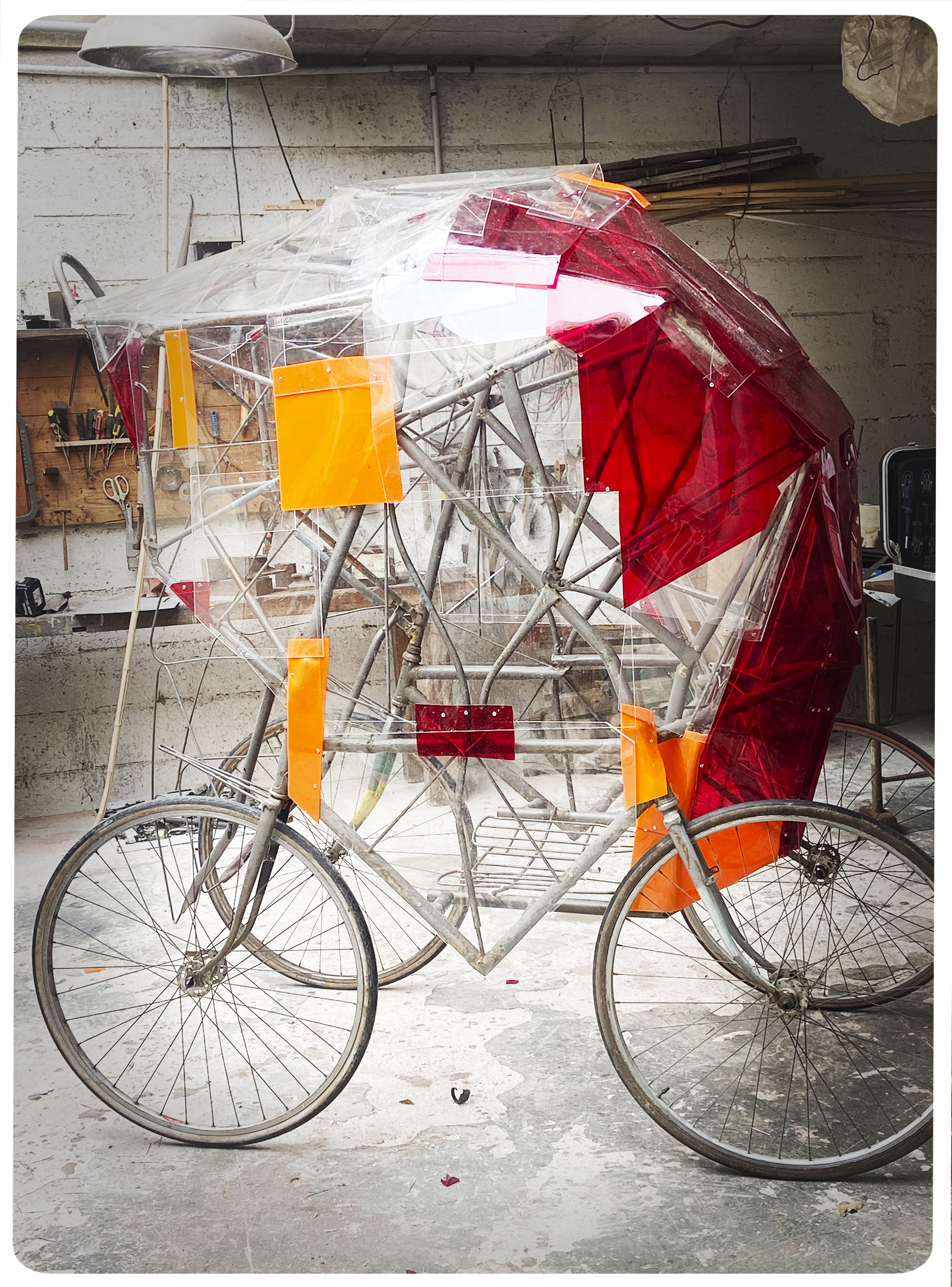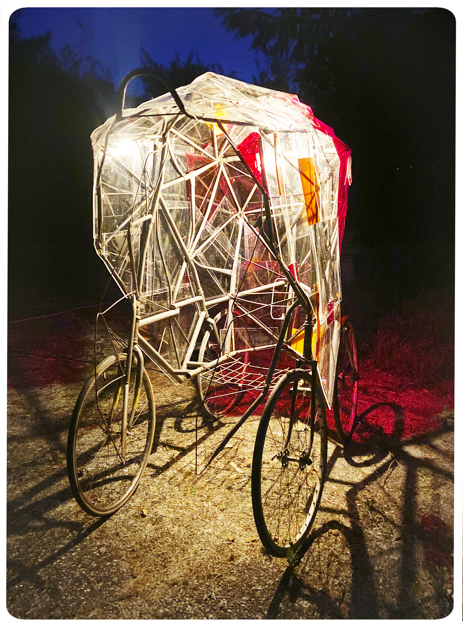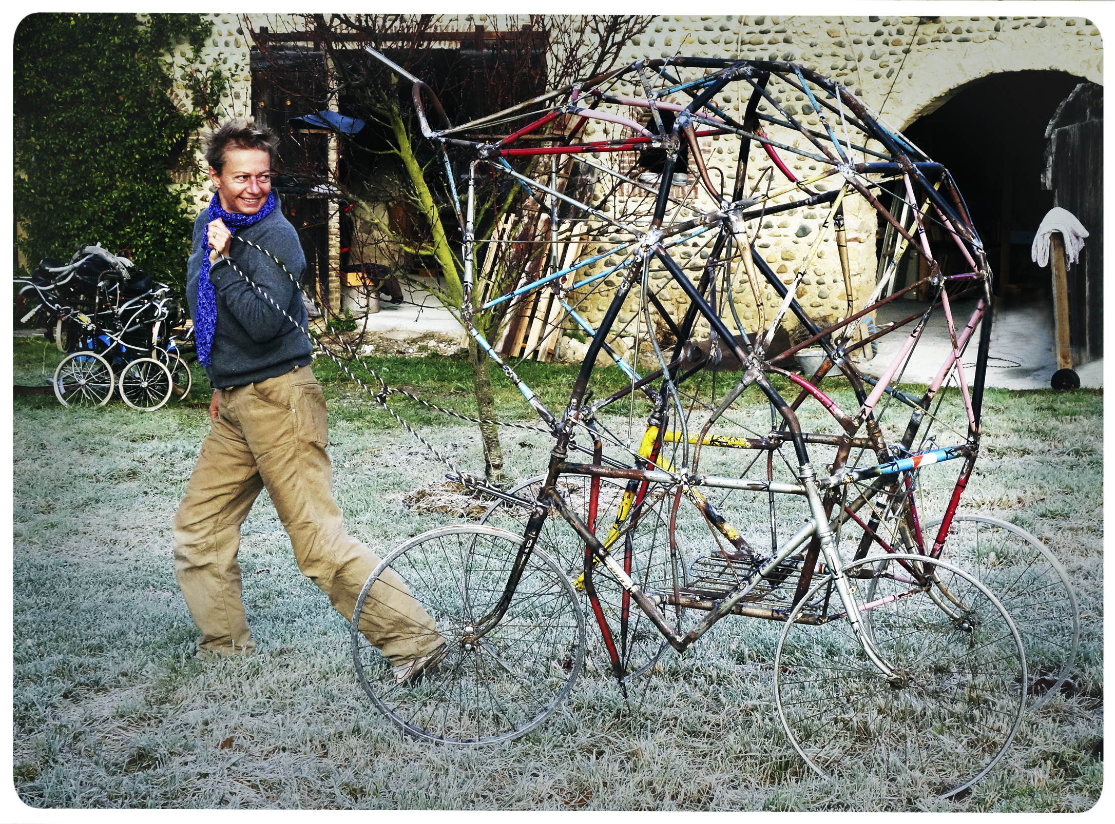 Après quelques semaines sans nouvelles, je finis par l’appeler. Il me dit : « Ah, oui, oui, c’est prêt ! » Pourquoi ne m’a-t-il pas appelée comme convenu, alors ? J’y vais, et je ne comprends pas ce que je vois. Je vois quelque chose, mais ce n’est plus ma boule de vélos. Je vois quelque chose qui a perdu son âme, sans même comprendre pourquoi. J’ai été tellement abasourdie que je l’ai payé, et je suis partie. C’est en arrivant à la maison que j’ai compris : il avait tout sablé, et mis une espèce de vernis. C’était tout gris, tout uniforme. Une catastrophe. Je n’y ai plus touché. Ce qui est bizarre, c’est qu’on me disait : « Oh, c’est super beau ton truc, j’adore ! », et moi, je répondais que non, et blablabla. Je racontais l’histoire. Je l’ai laissé dehors en me disant : ça va bien finir par rouiller et prendre un peu de matière. Eh bien non, ça restait impeccable. Et puis j’ai vendu la maison, et il a fallu appeler des déménageurs pour faire un devis. La fille qui est venue a dit : « Et le carrosse, on le prend ? », avec son accent du Midi. Un carrosse ? Je n’aurais jamais eu l’idée d’appeler ça un carrosse ! Alors bon, si c’était un carrosse, on le prenait, oui. Voilà donc « le carrosse » arrivé dans sa nouvelle maison. Ou dehors, ou dedans, selon mes humeurs. Un jour, je me dis : allez, il faut le finir, ce truc ! J’essaie avec des bouts de verre : c’est l’horreur. Je me coupe, ça tombe dès que le truc roule, je n’y arrive vraiment pas. Je laisse tomber, le remets dehors. Les araignées sont ravies, elles s’installent entre les structures . Ça me donne une idée : je vais, moi aussi, faire des toiles d’araignées, en fil de fer très fin, récupéré de mini bobines de matériel électronique. Et puis je décide d’y appliquer, avec de la colle à papier, des bandes de ce fin papier un peu translucide, qui sert à protéger les photos. Ce n’était pas trop mal, mais cela ne pouvait pas aller dehors. Et puis je voulais que ce soit un peu transparent, qu’on voie le paysage — ce n’était pas le cas…mais bon, je continue quand même. J’achète de la résine époxy que j’applique dessus. Catastrophe aussi : j’en avais plein les doigts, ça puait, coulait, et une fois sec, ça a pété de partout, tellement le papier s’était tendu. Donc j’arrache tout. Poubelle. Désespoir.