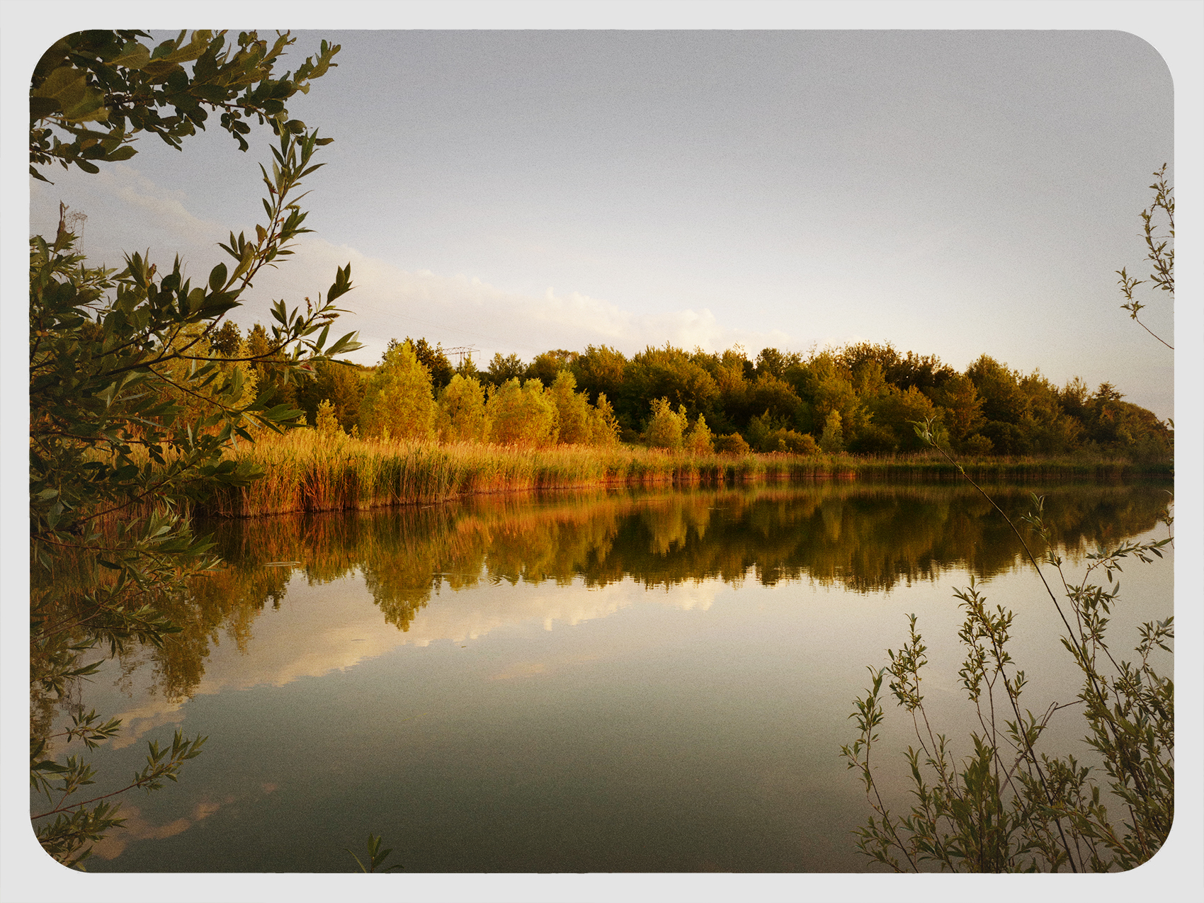 | | | | Plus j'avançais sur la route plus elle devenait "sauvage" et de grands pylônes électriques la bordaient maintenant. Je vois sur Google Maps que mon lac est à droite en dehors de cette route, et rebelote un grand portail. Mais il n'est pas fermé, il suffit de faire coulisser les pennes. Dans ce silence, ça fait du bruit, un bruit métallique qui résonne, et ça me fait un peu peur. Je referme bien comme il faut, ni vu ni connu. Un chemin descend, en terre, et je vois des chevreuils qui s'enfuient à mon approche, puis j'entends toujours ce drôle de son, comme un vieux moteur de tacot qui a du mal à démarrer. Apres c'est une famille de sanglier qui apparaît, et file à toute vitesse sur les cotés du chemin, dans les broussailles, les marcassins n'en finissant plus de traverser la route en courant et de disparaître, une famille nombreuse, comme lorsqu'on compte les moutons pour s'endormir. (je ne l'ai jamais fait, mais j'imagine). Puis là en bas, à travers les saules, les jeunes peupliers, et les ajoncs, une étendue d'eau, d'un beau bleu vert… Ni une ni deux je m'y plonge, après avoir caché mes vêtements, car je sens bien que ce lieu est fréquenté. Je n'y crois même pas, l'eau est froide mais bonne, je nage! Je nage seule, le ciel est bleu, j'en ris toute seule, j'ai mon lac, à moi! Enfin presque. |