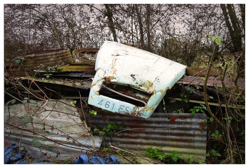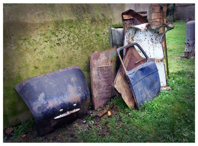 | | J'ai déjà parlé de Monsieur Blandin. Il a fini sa vie à Labatut, et de son fauteuil favori, celui près du poêle à mazout, dans lequel il a été trouvé mort, il pouvait par un jeux de miroir, fait avec deux vieux rétroviseurs, voir ce qui se passait dans le fond du jardin. Il devait avoir une bonne vue. Je ne sais pas si par ricochet il arrivait aussi à tirer son "souper" de son fauteuil. J'ai aussi raconté que Jürgen qui venait d'acheter une 4L beige, a effrayé un soir tout le village: Blandin avait la même, qu'il garait à l'exacte place où Jurgen avait garé la sienne. Les habitants ont cru qu'il était ressuscité. Apparemment c'était un original, qui était moyennement apprécié. Il était assez sale portait un chapeau chinois pointu en paille, et offrait des pastis à ses visiteurs dans des verres noirs de crasse. La ressemblance avec Jurgen ne dépassait pas l'histoire de la voiture. Donc ces capots, ils avaient une histoire, des histoires, et je les voulais absolument pour mon nouveau chez moi, ils étaient précieux, et en plus pour moi les voitures, la voiture en général est un sujet épineux. |