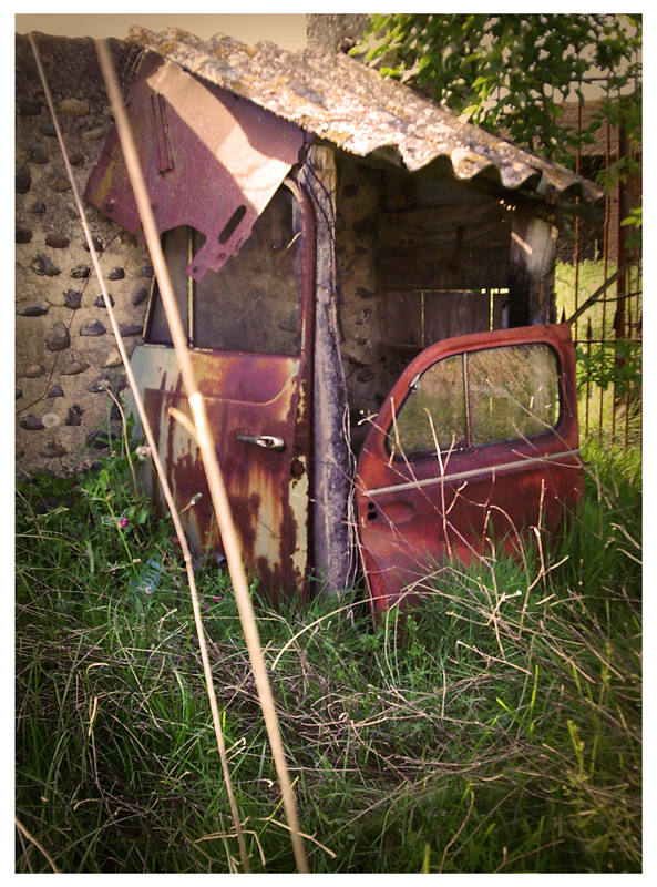 | | Il me faut donc parler de ces capots de voiture: lorsque nous avons acheté la maison à Labatut-Riviere nous avons trouvé des petits abris disséminés dans le jardin. Il nous a fallut faire une petite enquête avant de comprendre: remarquer les traces de petits plombs sur les façades de la maison autour des fénestrons du grenier, puis dans la "tour" qui était encore vide de plancher et de toiture mais habitée par des dizaines de pigeons. Trouver des douilles de fusil de chasse un peu partout dans l'herbe, et apprendre que le seul habitant humain de cette maison dans les dix dernières années précédant notre installation était Monsieur Blandin. Un ancien garde-chasse, qui vivait de pas grand chose, et se nourrissait de petit gibier. Il s'était donc construit des affûts avec de vieux capots de 4L, de 4 chevaux et d'autres morceaux de veilles voitures non identifiées encore à ce jour, dans lesquels il s'asseyait pour guetter son dîner. |
