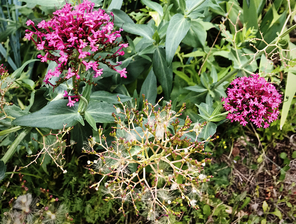 | | | | l y a quelques années je regardais avec envie tous les bouquets de valérianes qui poussaient naturellement dans les minuscules interstices entre les murs de clôture des jardins et les trottoirs. Ces fleurs semblent avoir besoin d’être tranquilles, de ne pas supporter d’autres plantes autour d’elles, ce qui ne les empêchent pas de faire de gros bouquets de tiges, de feuilles et de fleurs. Elles vivent quand même en communauté, mais qu’avec leurs très semblables congénères. Les endroits préférés des valérianes, que l’on trouve ici, car il y a de nombreuses espèces, sont les lieux incultes, les vieux murs, les rocailles, et on se demandent comment elles font pour produire de si grosses tiges qui portent autant de fleurs, à partir d’une minuscule fente dans le béton, la brique ou l’asphalte, d’où elles s’épanouissent on ne sait comment …J’ai envie de les féliciter de coloniser ces lieux ingrats et de nous donner de si belles fleurs. Une fois fanées elles donnent alors des fruits que l’on prend pour des graines, accrochées à de petites plumettes qui s’envolent un peu partout, les akènes. |