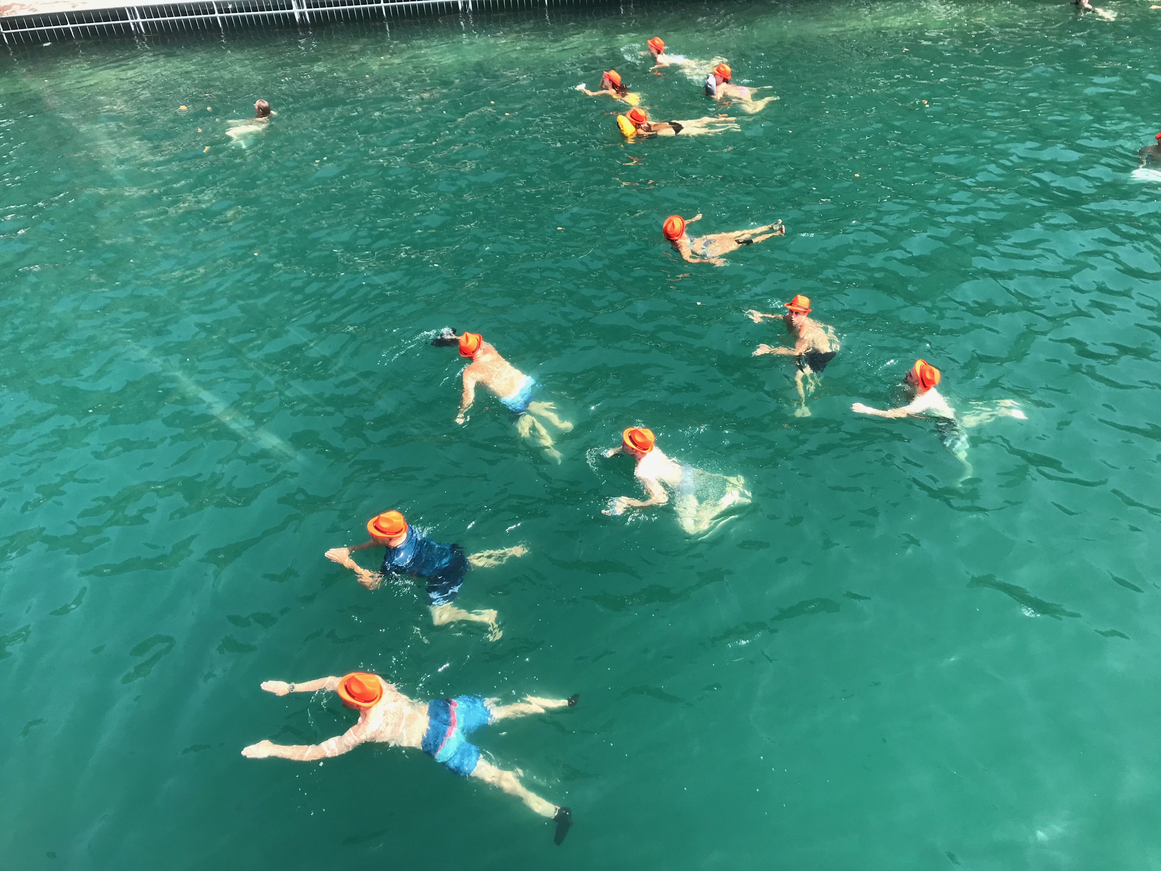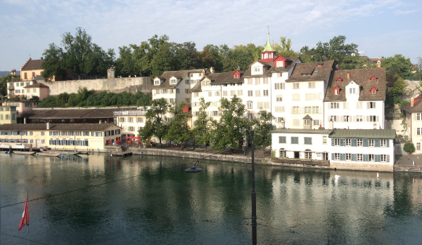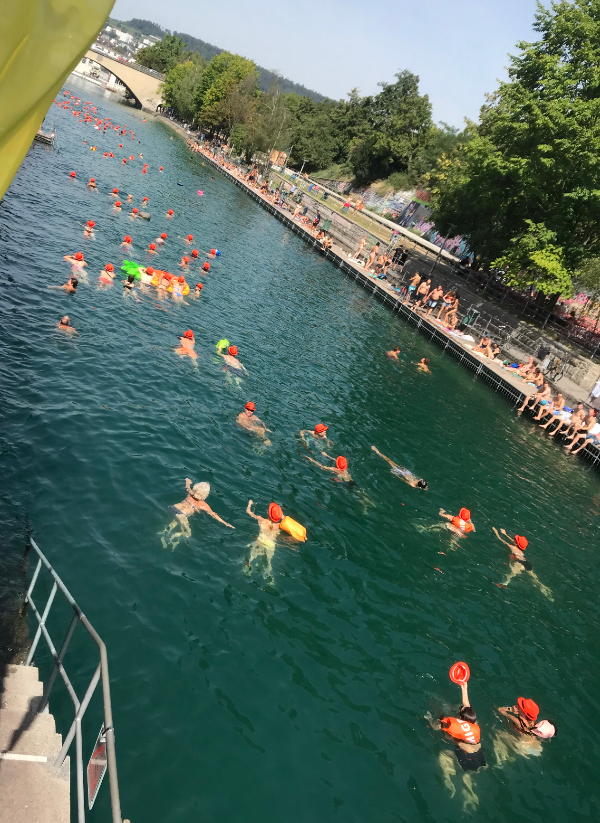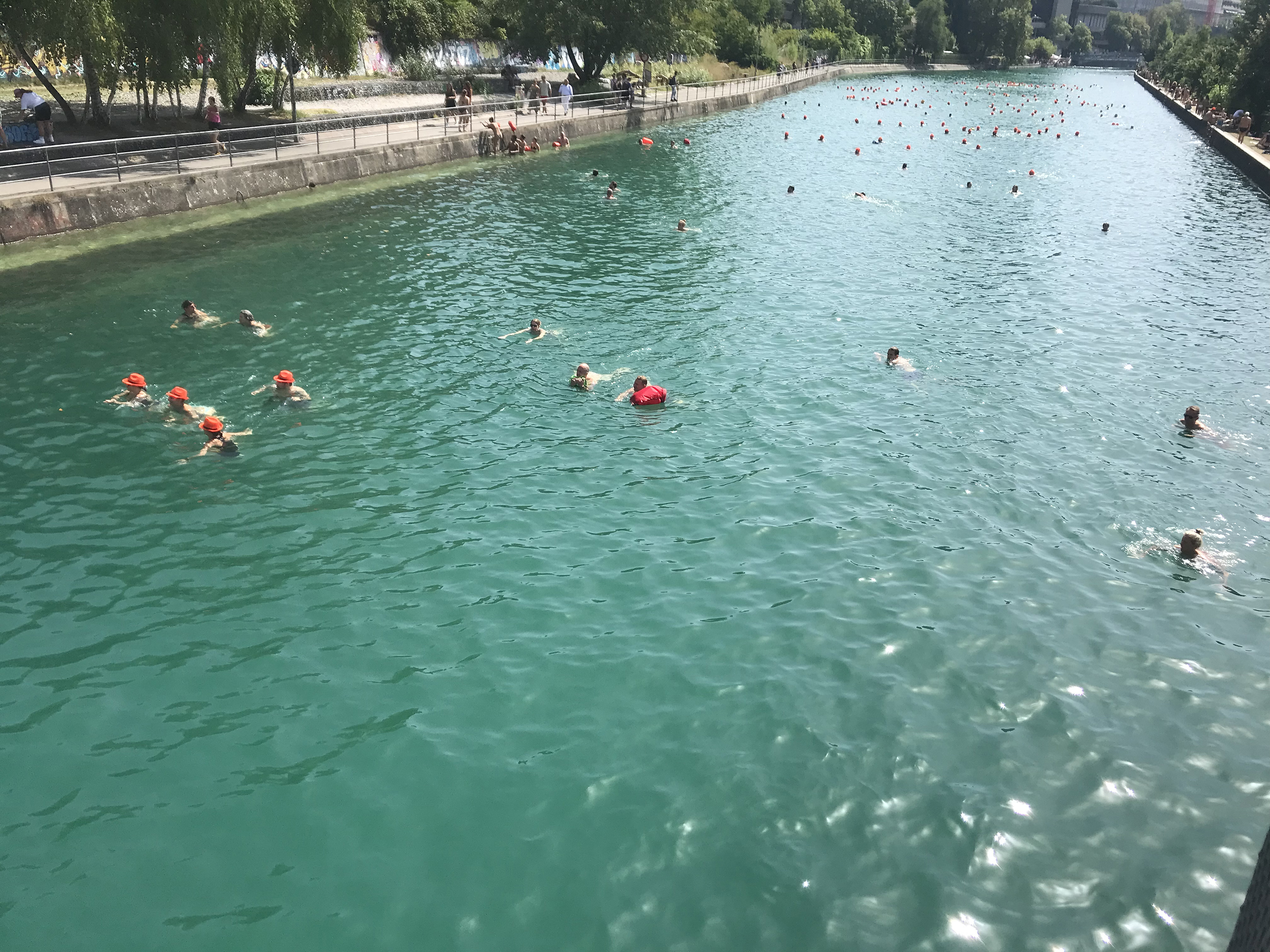 L'étape: Je décidai alors que tant qu’à dépenser de l’argent, ce serait plus malin de rester une nuit à Zurich que je ne connaissais pas, j’avais toute une après-midi devant moi et une bonne partie de la journée du lendemain. Je trouvai un hôtel à trois minutes de la gare en plein centre-ville avec vue sur le fleuve bien moins cher que les autres tous hors de prix car proposant peu de service : des chambres hyper simples sans clim ni tv, ni parfois de salle de bains privée, mais un lavabo dans la chambre, puis un genre de petit lobby-salon-salle à manger avec grand frigo transparent pour mettre ses victuailles étiquetées avec nom et date de départ. Il y avait même une étagère intitulée « free » avec ce que les anciens voyageurs n’avaient pas envie de remporter. Puis un micro-onde, une bouilloire, du thé et du café, et une réception tenue par différentes jeunes filles très aimables, style "job d'étudiantes". L’après-midi malgré la chaleur de folie, je fis un immense tour (j’avais avec moi mon petit vélo pliant) et j’essayai de trouver un endroit au bord du lac où me baigner. Il y en avait pléthore mais tellement de monde que cela ne donnait pas très envie. Les gens très gais étaient aussi bien sur les berges, bronzant, mangeant, jouant, écoutant de la musique et fumant des pétards, que dans l’eau où ils barbotaient. Puis je vis une série de nageurs, tous avec des bonnets de bains vert fluo qui se dirigeaient dans le même sens dans un large couloir de nage, balisé par des lignes flottantes et, disposées régulièrement le long du chemin, de jolies barques en bois dans lesquelles officiaient des hommes ou des femmes en teeshirt à raie blanches et bleues armés de perches et de bouées. C’était l’évènement annuel de la traversée du lac. Un kilomètre et demi. Contrairement à celui de Lugano, de deux kilomètres et demi, celui-ci ne semblait pas être une course. Les nageurs, allaient à une allure assez peu sportive, en brasse principalement et cela même en papotant. Je me redirigeai alors vers le centre-ville où de grands établissements anciens tout en bois, semblant historiques, (rappelant un peu la regrettée piscine Deligny) dont l’un réservé uniquement aux femmes débordaient de monde. Les piscines n’y sont là que des découpes rectangulaires pas très grandes, pratiquées dans les planchers directement ouvertes sur l’eau du lac ou de la rivière Limmat. Tout cela me réjouissait, mais je n’arrivais pas à choisir un endroit, aucun ne me paraissait correspondre à ce que je voulais sans savoir vraiment quoi, sans doute moins de monde, et une eau plus librement accessible. J’avais la flemme d’aller plus loin, et retournai alors faire une balade dans la ville elle-même, un peu frustrée de ma baignade ratée. |
