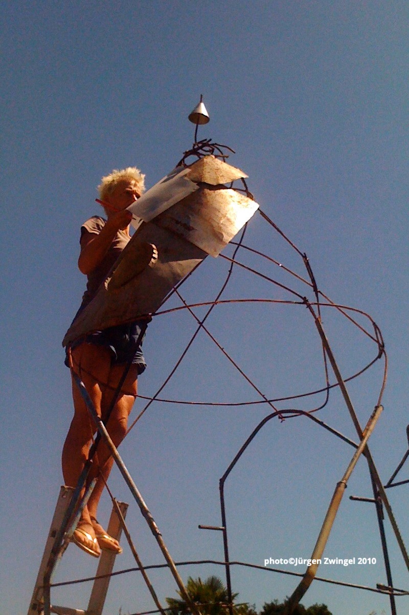 J’ai toujours été persuadée que je soudais mal. Je parle de la soudure à l’arc, celle qui fait des étincelles partout, comme des feux d’artifice. Évidement je n’ai pas appris, j’ai tâtonné et c’est peut-être pour cela que je me suis forgée cette conviction. Pourtant apres toutes ces années, je devrai souder correctement non ? Quand j’ai fait la grande fusée, je n’ai soudé que des matériau de récupération jamais de la même épaisseur, jamais du même genre d’acier : creux, pleins, forgés ancien, tuyaux de chauffage, fer à béton moderne, structure de lit, cornières etc… Tout ça plus ou moins perchée sur une échelle à cinq mètres de haut ... Tout ce que je trouvais je le soudais afin de fabriquer une structure, puis je l’ai recouverte de tôles, récupérées aussi. Bref, n’empêche, que même si je soude mal comme je le crois, elle tient cette fusée depuis un certain nombre d’années, une quinzaine, et a même été couchée, trimballée, remise debout, exposée, re-trimballée sur plusieurs centaines de kilomètres, et re-re-remise debout. Elle vit dehors, sans protection ni réparations, et les poules se mettent même dessous pour se reposer d’avoir fait des œufs. (Pour lui donner l’idée d’en faire aussi ?) |